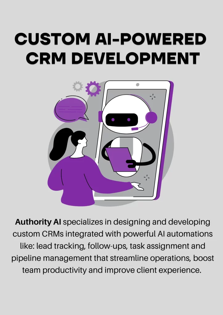 Built from the ground up with AI-powered CRM development, Authority AI CRM combines the power of automation with intelligent data tracking to help you close more deals, follow up faster, and scale your operations—without the chaos. It’s not just another software—it’s the CRM your business has been waiting for.